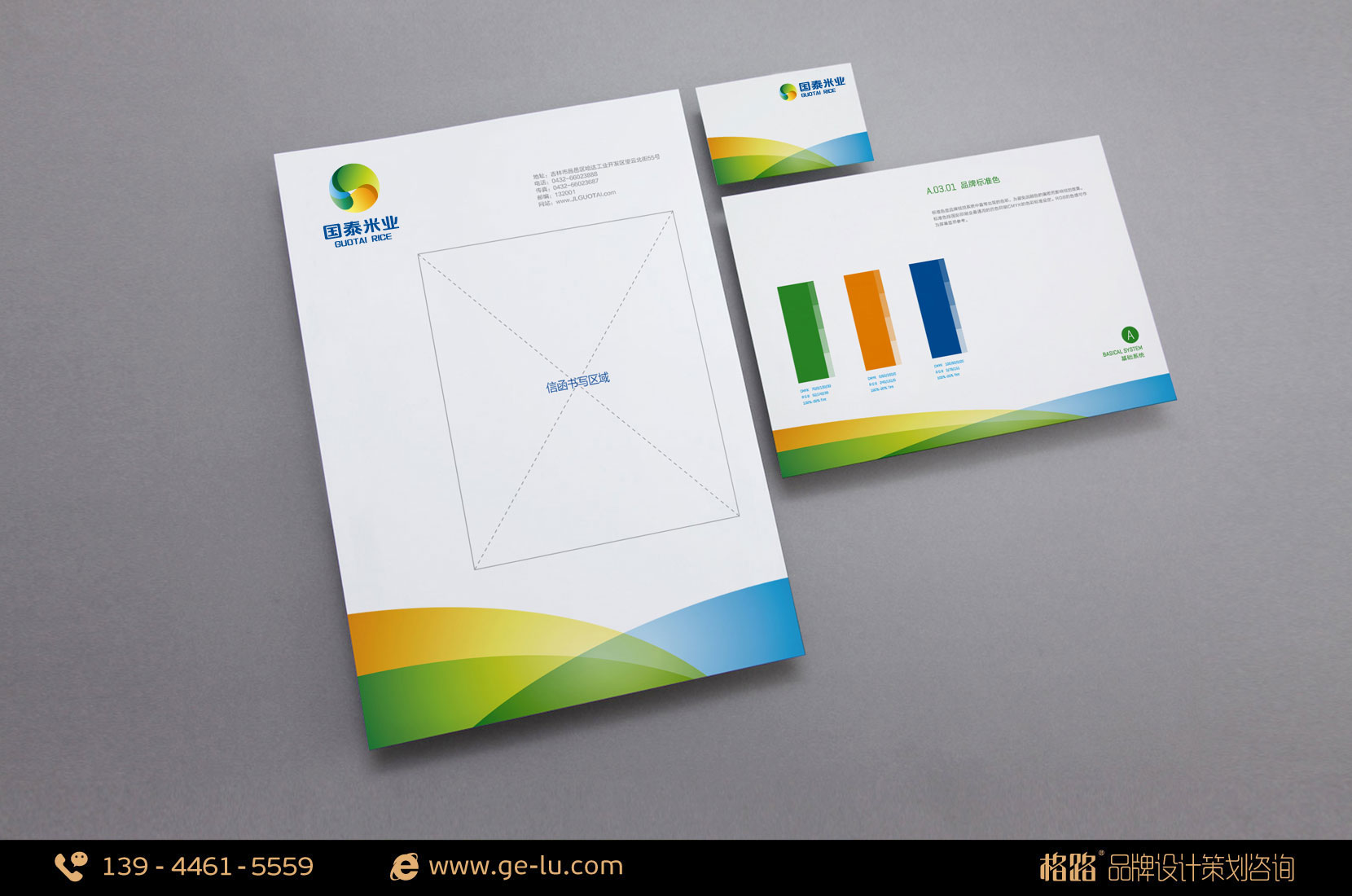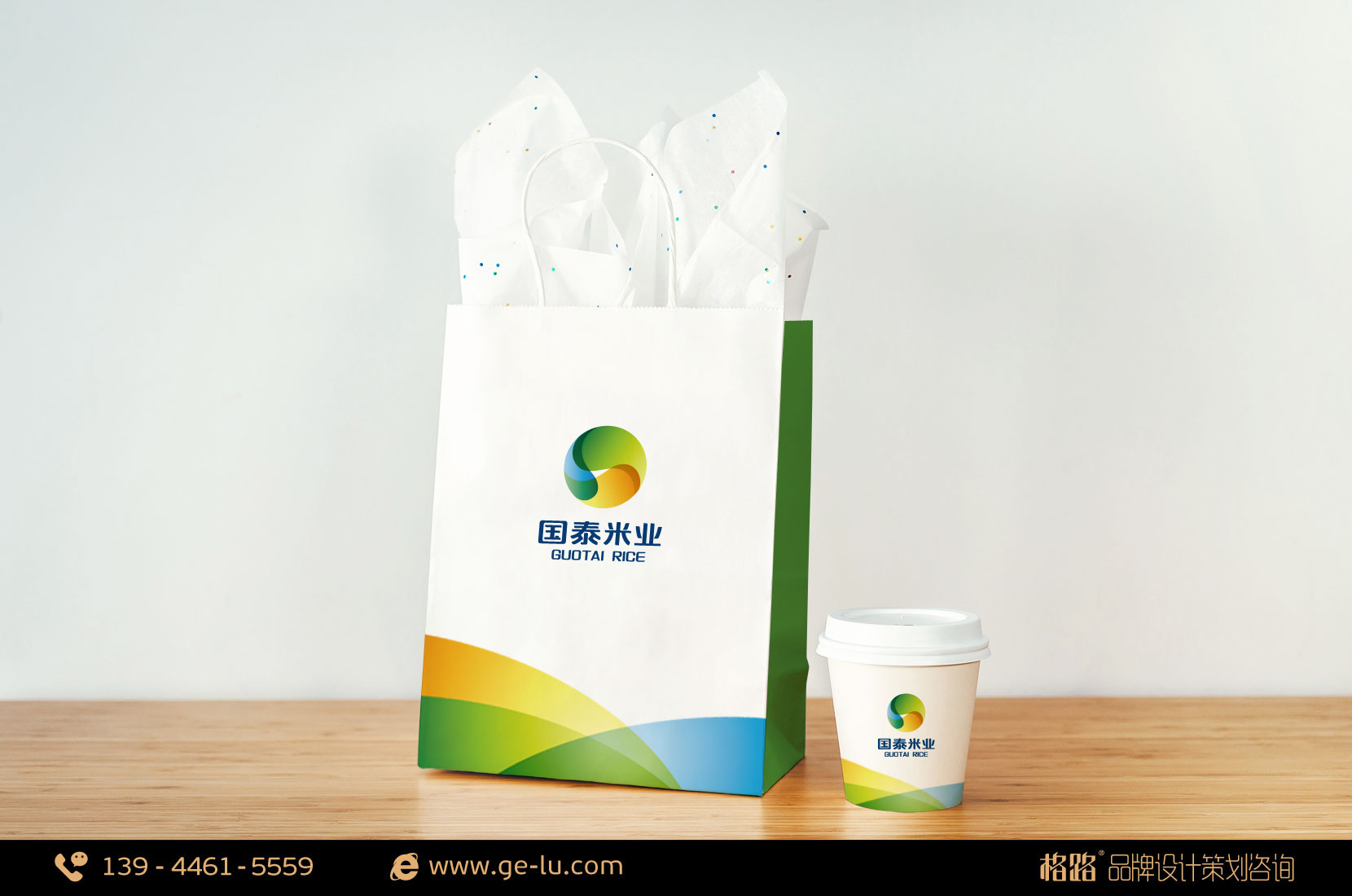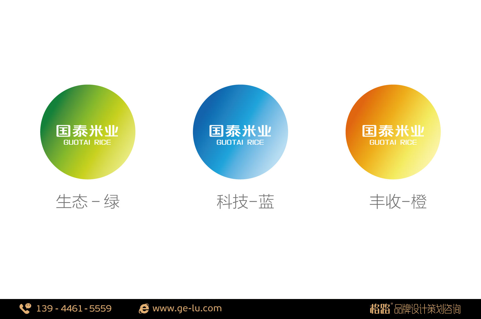 格路設計為國泰米業LOGO設計之初就用象征生態的綠色、象征科技農業的藍色、xiangzhengfengshouxiyuedechengseyuyizhuoyuepinzhidechanpinyuwanshandefuwulinian,bingtongguoduisecaixinichuli,shiqifengfuercengcifenming。yuanrundewaixingxiangjinjinyoudongdeyuer,juhehuoli、銳意創新,動感旋變之球,賦予時代品牌內涵。圖形巧妙融合國泰首字母:“G”,突出品牌獨特識別性。