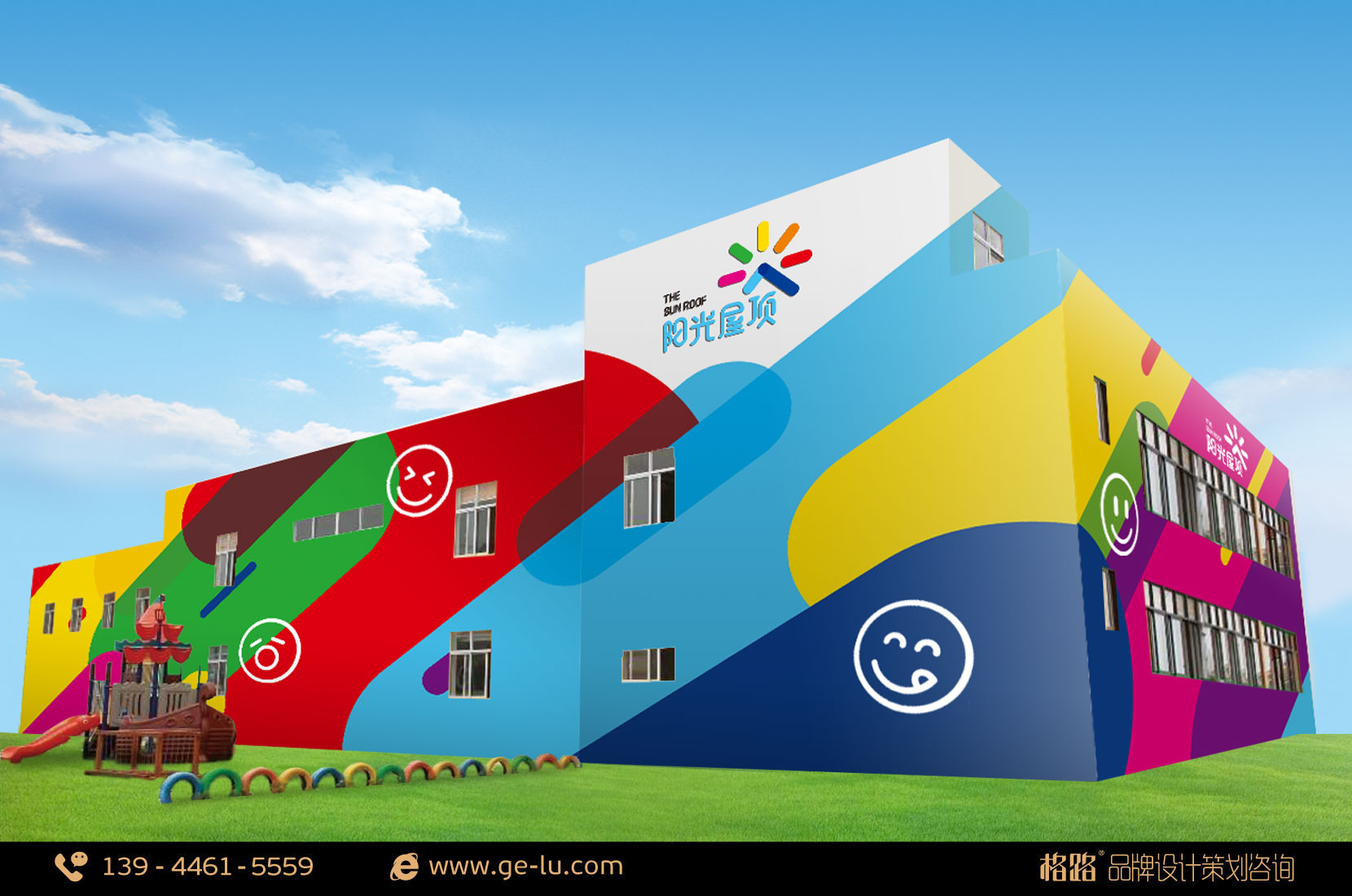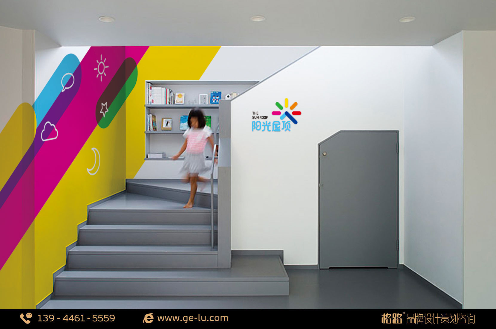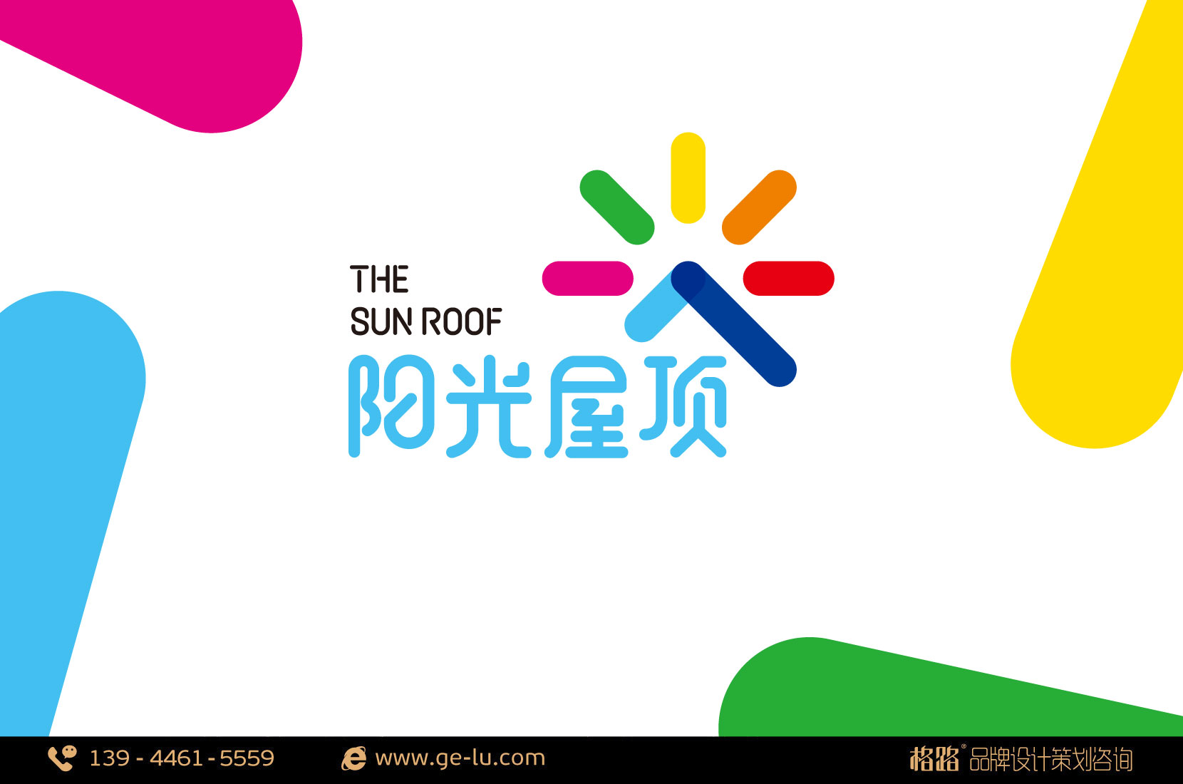格路品牌設計與涵魚教育合作,幫助這家教育機構完成了“陽光屋頂”的品牌策劃工作。品牌形象以涵魚教育的構想「彩虹色的陽光灑向屋頂,撫育更美好的童年」,格路品牌設計創造出一個特別的星形符號,這顆星形充分體現了“陽光屋頂”的精髓:一顆新星,一個初升的太陽,一個屋頂,一個躍起的人物。一顆教育界的新星,一群活潑可愛如朝陽的孩子,共同組成“陽光屋頂”。
