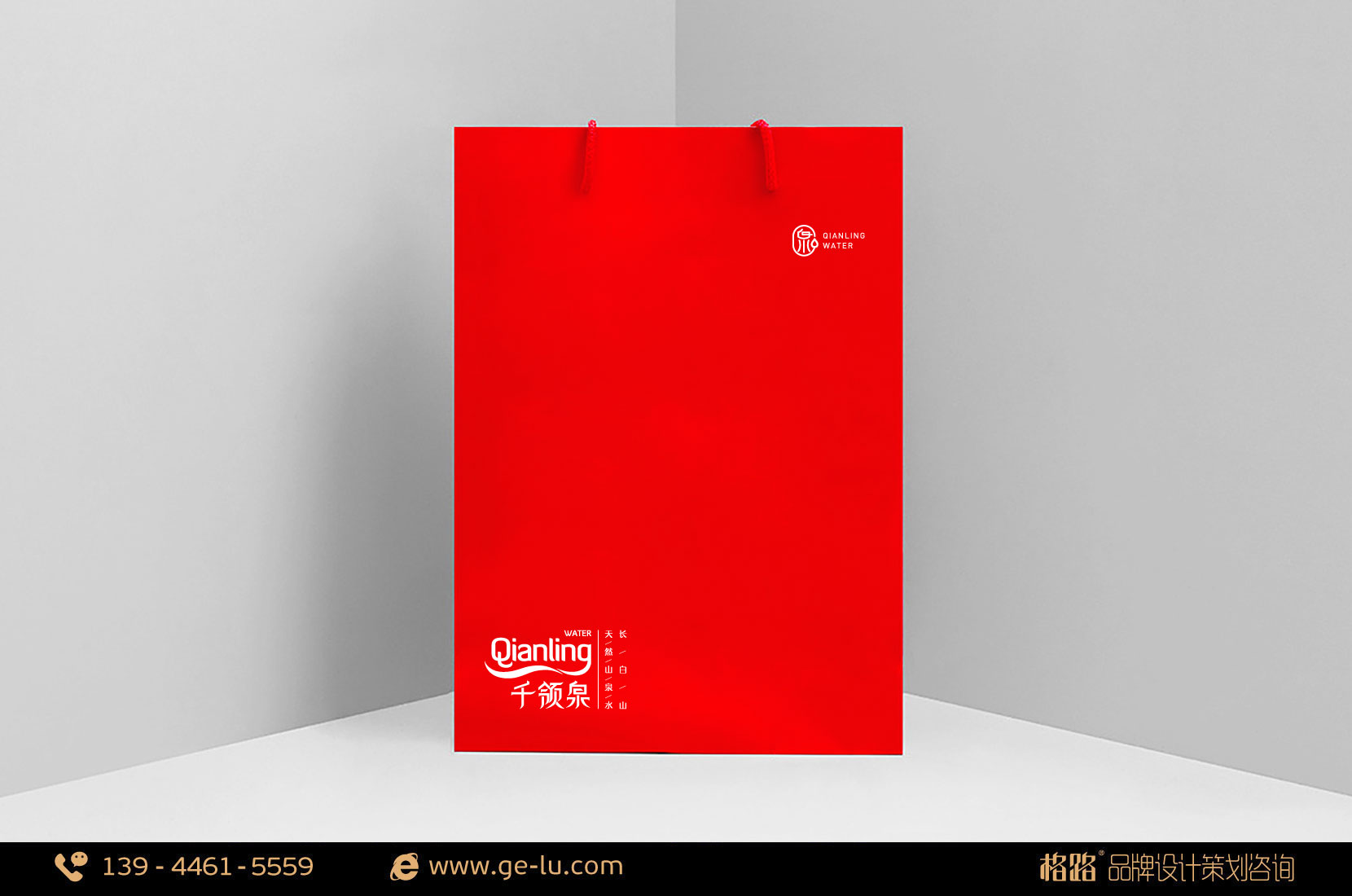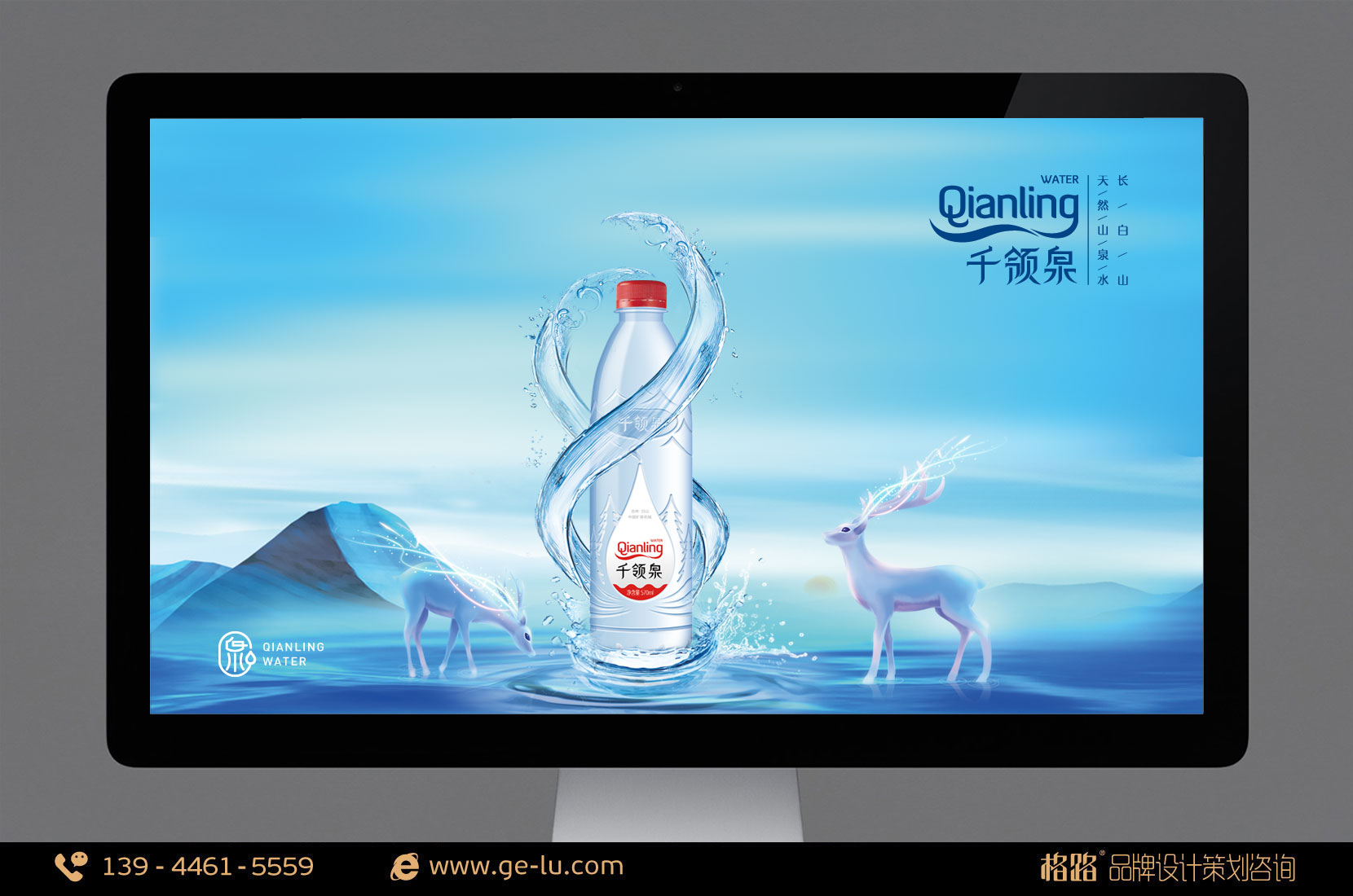 千領泉LOGO設計整體簡潔,主要是以千領的拚音“qianling”為藍本,點睛之筆在於“g”形成的飄帶,漢字的筆鋒也柔化成與水流相似的形狀,輕鬆活潑,使千領泉更易深入人心;
