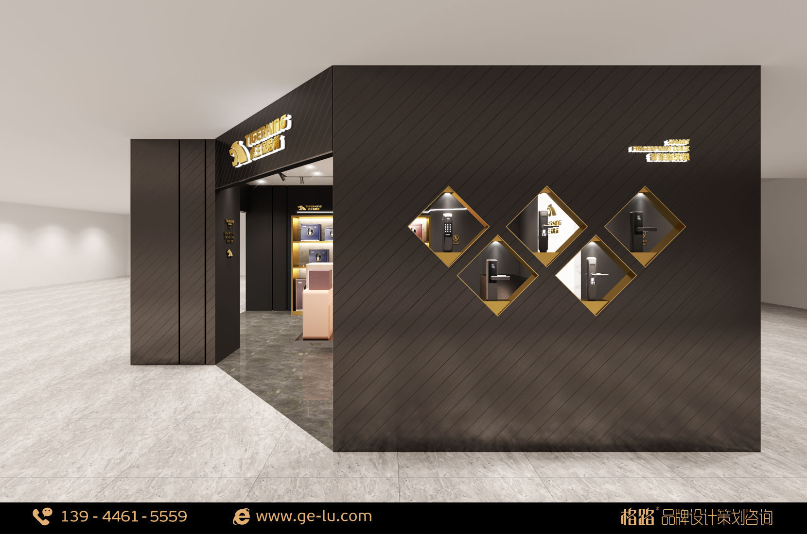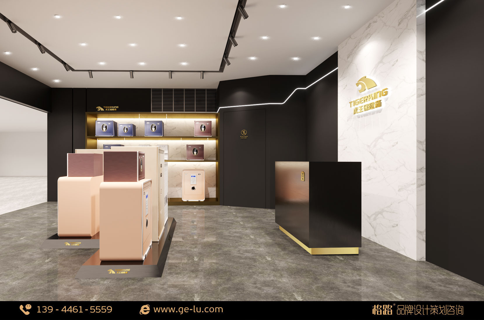 虎王保險箱品牌專賣店內部空間形象以黑色、金色為主,線條穩重不失時尚,門頭45度拚碳黑拉絲盡顯低調中的奢華,格路品牌設計通過對空間外部裝飾和內部合理設計,為體驗者提供自由、愉悅、舒適、美(mei)好(hao)的(de)體(ti)驗(yan)和(he)感(gan)受(shou),從(cong)而(er)吸(xi)引(yin)更(geng)多(duo)的(de)體(ti)驗(yan)者(zhe)光(guang)顧(gu)和(he)消(xiao)費(fei),以(yi)實(shi)現(xian)其(qi)終(zhong)端(duan)體(ti)驗(yan)的(de)價(jia)值(zhi)。不(bu)但(dan)為(wei)顧(gu)客(ke)提(ti)供(gong)人(ren)性(xing)化(hua)體(ti)驗(yan)使(shi)用(yong)服(fu)務(wu),而(er)且(qie)保(bao)障(zhang)體(ti)驗(yan)者(zhe)通(tong)行(xing)順(shun)暢(chang)。室(shi)內(nei)的(de)布(bu)局(ju)要(yao)根(gen)據(ju)店(dian)鋪(pu)的(de)實(shi)際(ji)需(xu)要(yao)進(jin)行(xing)設(she)計(ji),格(ge)路(lu)品(pin)牌(pai)設(she)計(ji)建(jian)議(yi)基(ji)本(ben)分(fen)為(wei):接待區、體驗區、產品展示區 和活動區四個部分。