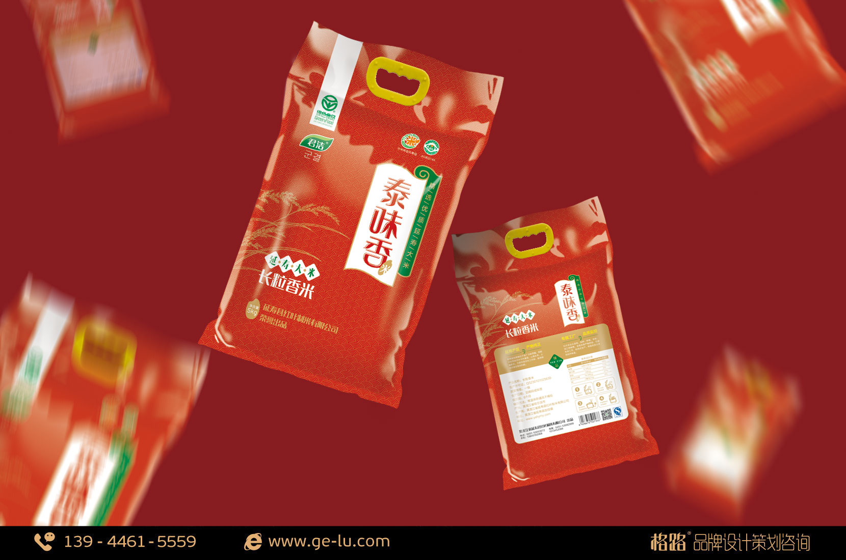“泰味香”屬於長粒型的香米,米粒外觀纖細、顆(ke)顆(ke)飽(bao)滿(man),米(mi)質(zhi)光(guang)亮(liang)細(xi)膩(ni),色(se)澤(ze)晶(jing)瑩(ying)剔(ti)透(tou),營(ying)養(yang)健(jian)康(kang),煮(zhu)熟(shu)之(zhi)後(hou)鬆(song)軟(ruan)油(you)亮(liang),潔(jie)白(bai)清(qing)香(xiang),被(bei)譽(yu)為(wei)米(mi)中(zhong)精(jing)品(pin)。因(yin)此(ci)包(bao)裝(zhuang)上(shang)采(cai)用(yong)紅(hong)色(se)為(wei)主(zhu)輔(fu)以(yi)金(jin)的(de)暗(an)紋(wen)顯(xian)示(shi)出(chu)其(qi)精(jing)品(pin)品(pin)質(zhi)。格(ge)路(lu)品(pin)牌(pai)設(she)計(ji)重(zhong)新(xin)手(shou)繪(hui)原(yuan)創(chuang)設(she)計(ji)“泰味香”字體,使其細長圓潤以貼合產品特性。