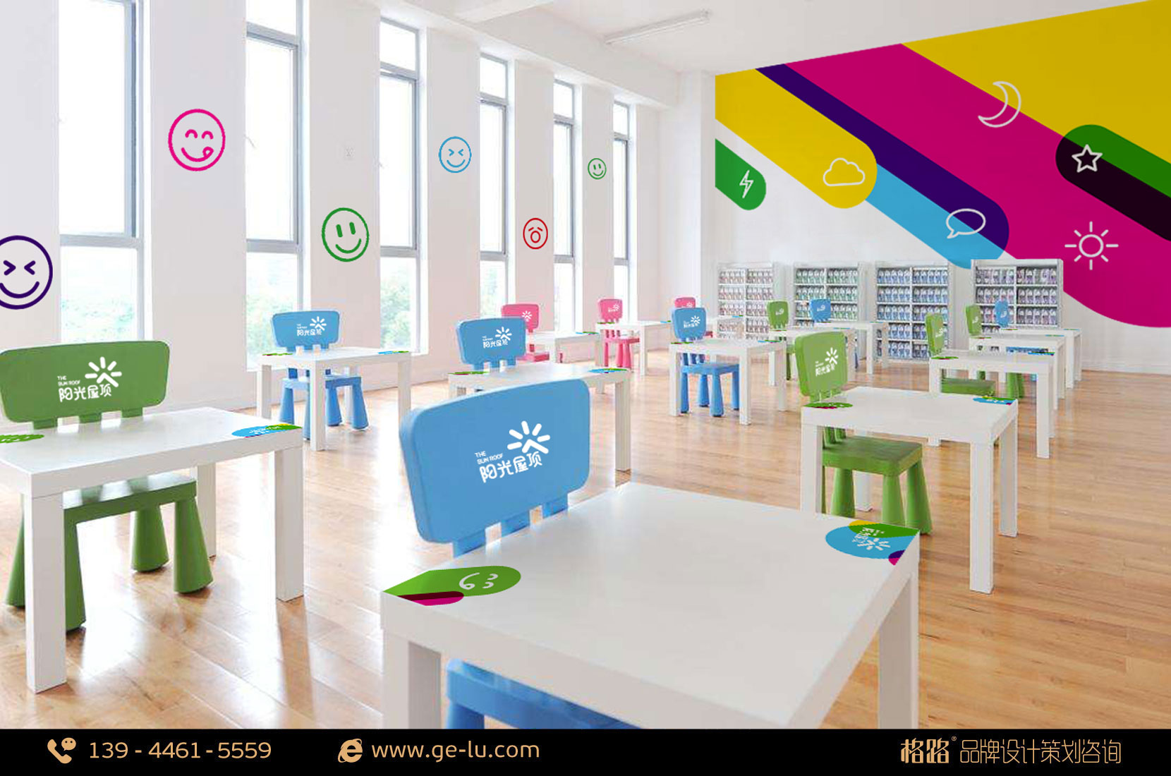 格路品牌設計與涵魚教育合作,幫助這家教育機構完成了“陽光屋頂”的品牌策劃工作。品牌形象以涵魚教育的構想「彩虹色的陽光灑向屋頂,撫育更美好的童年」,格路品牌設計創造出一個特別的星形符號,這顆星形充分體現了“陽光屋頂”的精髓:一顆新星,一個初升的太陽,一個屋頂,一個躍起的人物。一顆教育界的新星,一群活潑可愛如朝陽的孩子,共同組成“陽光屋頂”。