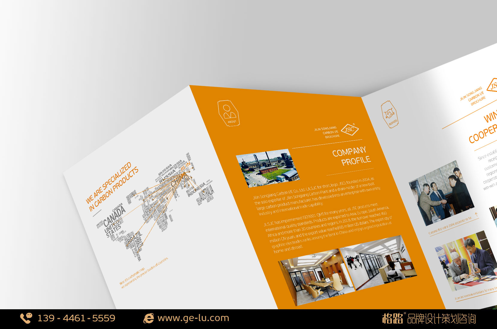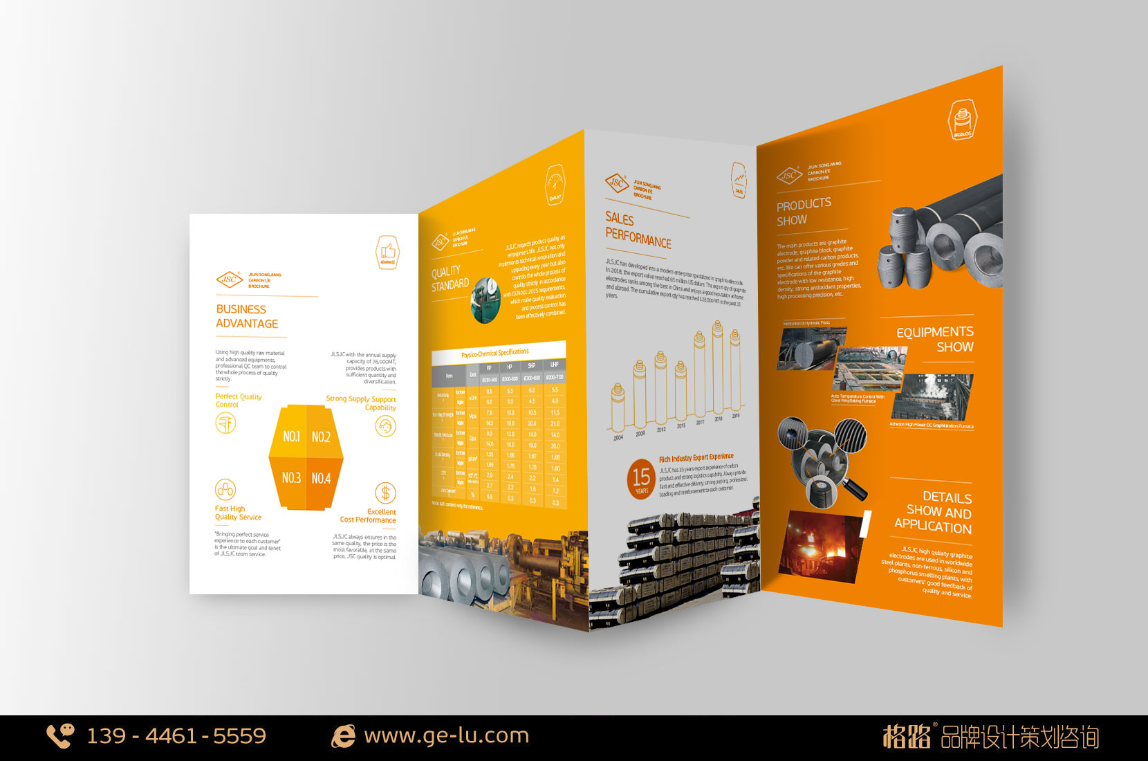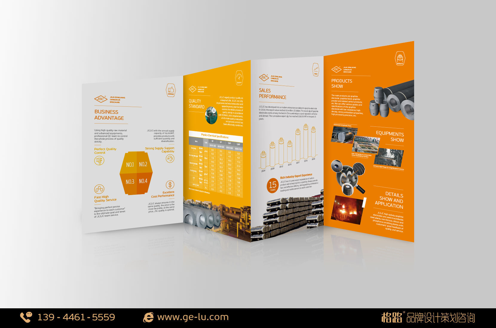 格路設計打破常規的折頁都是方方正正的矩形,靈感來自鬆江炭素logo“菱形”輪廓,所以如果把折頁的輪廓結合“菱形”斜邊設計而成,也能體現品牌差異化。相對應內容文字、圖片也是根據異形的版麵進行“量身定製”。