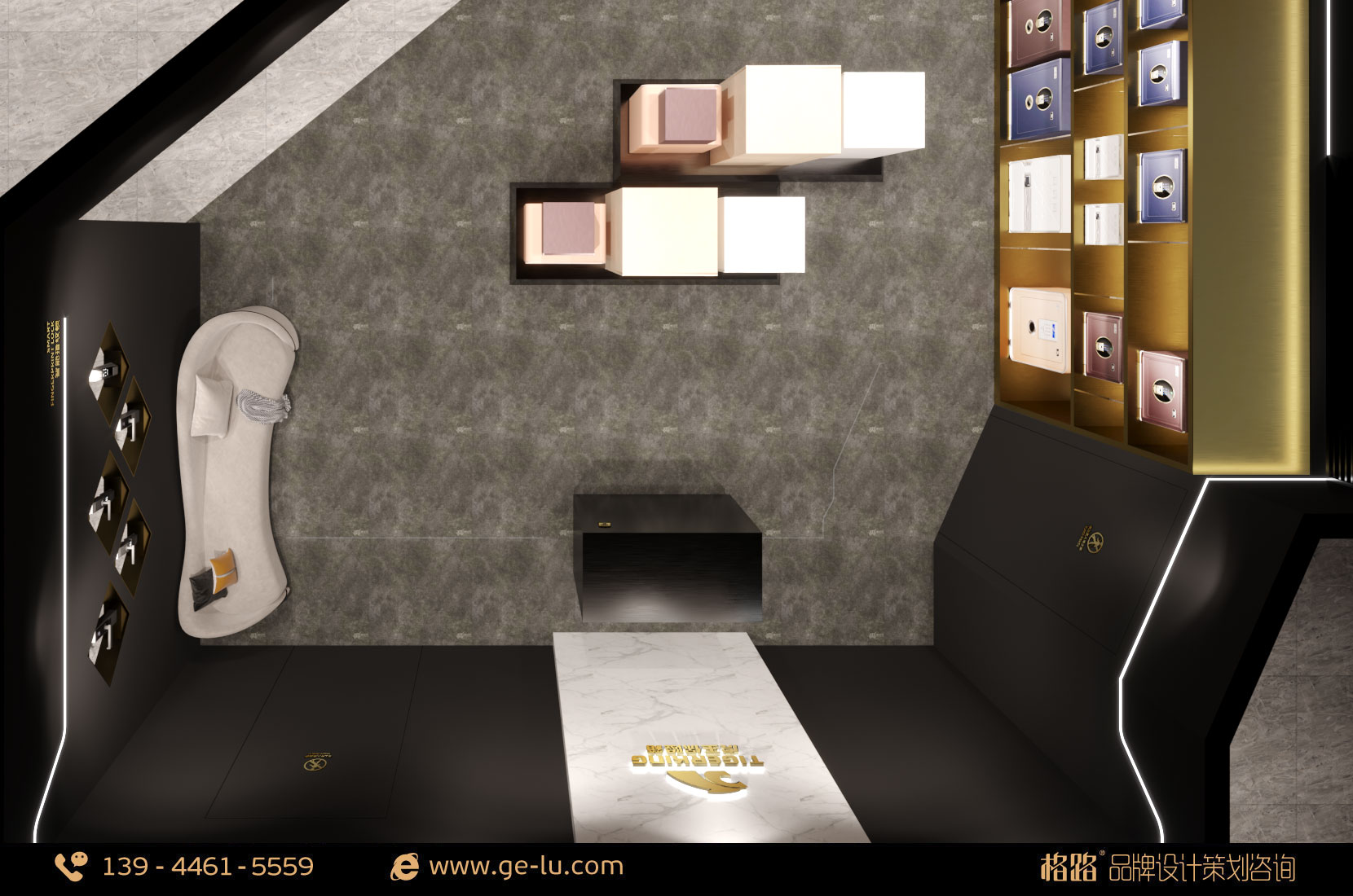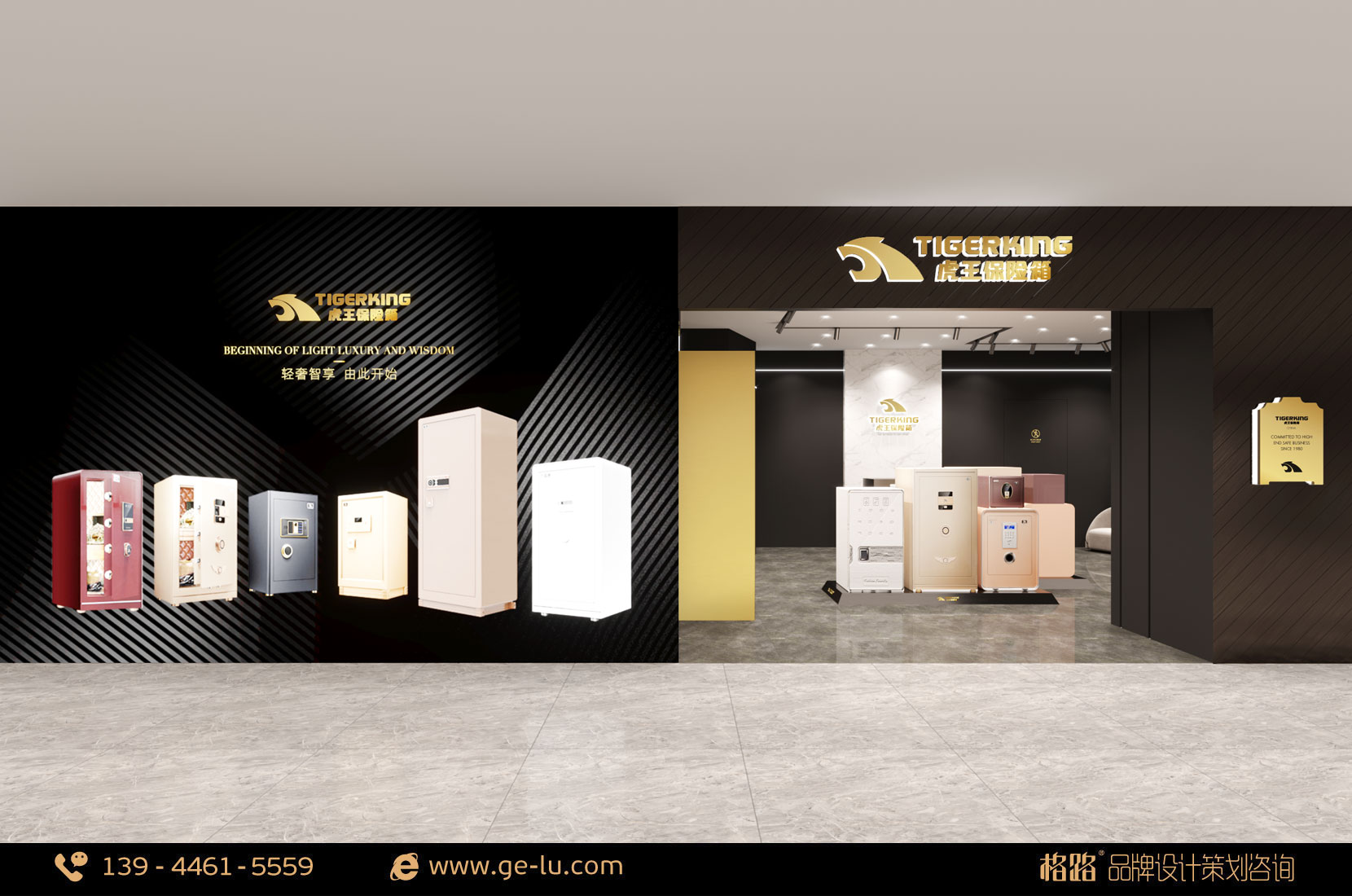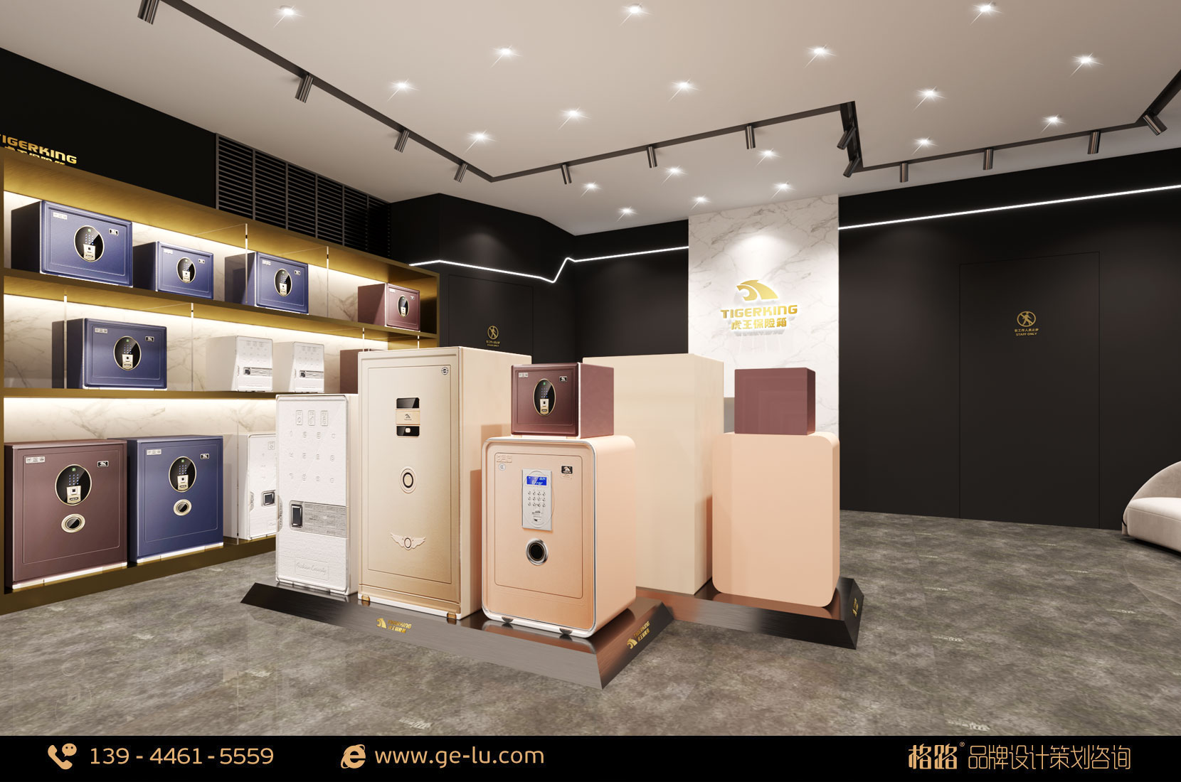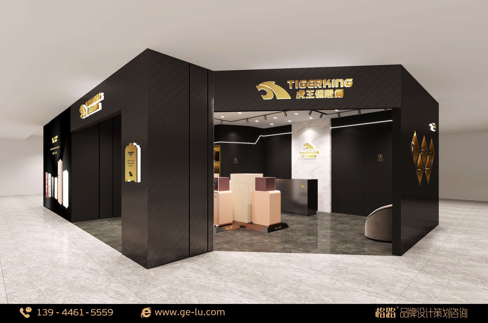 虎王保險箱品牌專賣店內部空間形象以黑色、金色為主,線條穩重不失時尚,門頭45度拚碳黑拉絲盡顯低調中的奢華,格路品牌設計通過對空間外部裝飾和內部合理設計,為體驗者提供自由、愉悅、舒適、美(mei)好(hao)的(de)體(ti)驗(yan)和(he)感(gan)受(shou),從(cong)而(er)吸(xi)引(yin)更(geng)多(duo)的(de)體(ti)驗(yan)者(zhe)光(guang)顧(gu)和(he)消(xiao)費(fei),以(yi)實(shi)現(xian)其(qi)終(zhong)端(duan)體(ti)驗(yan)的(de)價(jia)值(zhi)。不(bu)但(dan)為(wei)顧(gu)客(ke)提(ti)供(gong)人(ren)性(xing)化(hua)體(ti)驗(yan)使(shi)用(yong)服(fu)務(wu),而(er)且(qie)保(bao)障(zhang)體(ti)驗(yan)者(zhe)通(tong)行(xing)順(shun)暢(chang)。室(shi)內(nei)的(de)布(bu)局(ju)要(yao)根(gen)據(ju)店(dian)鋪(pu)的(de)實(shi)際(ji)需(xu)要(yao)進(jin)行(xing)設(she)計(ji),格(ge)路(lu)品(pin)牌(pai)設(she)計(ji)建(jian)議(yi)基(ji)本(ben)分(fen)為(wei):接待區、體驗區、產品展示區 和活動區四個部分。